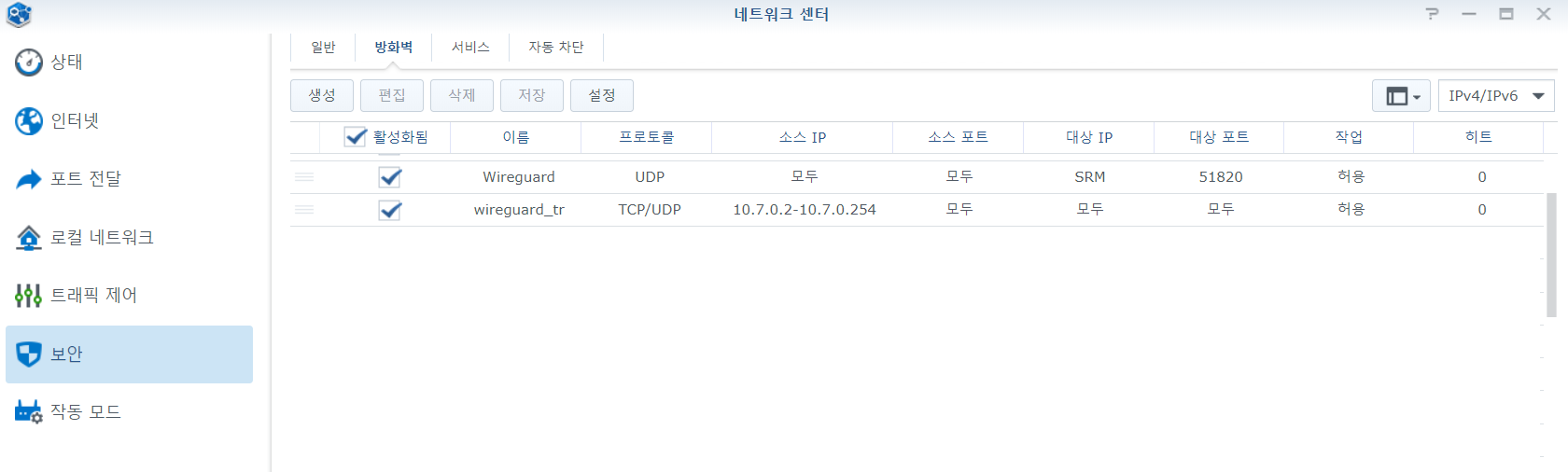 wiregurad 사용을 위해서는 시놀로지 라우터에서 방화벽 설정을 아래와 같이 해주어야 한다.